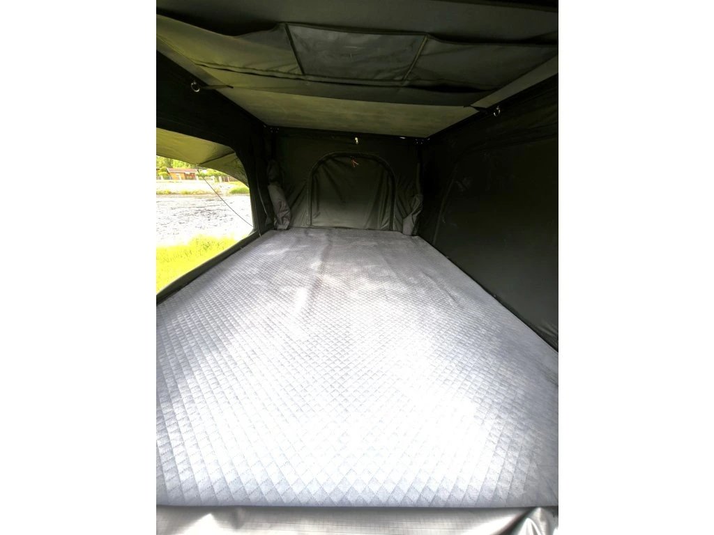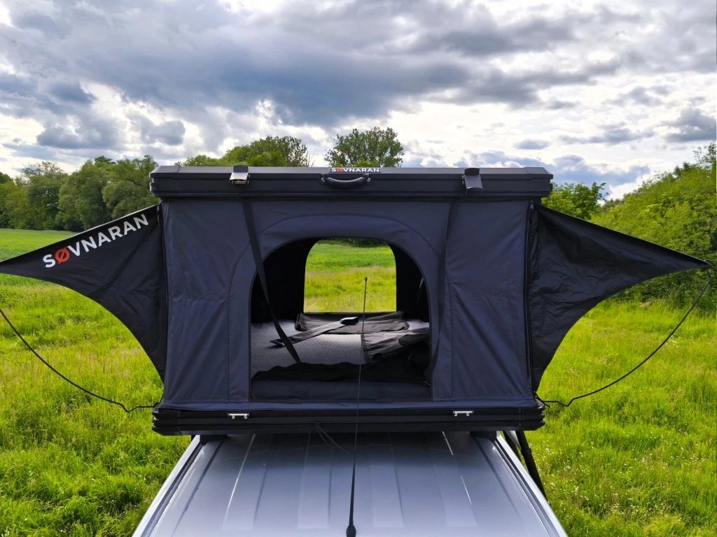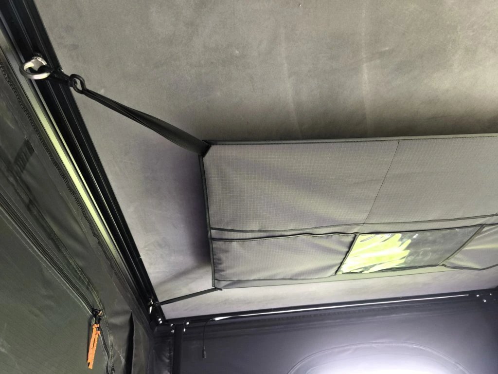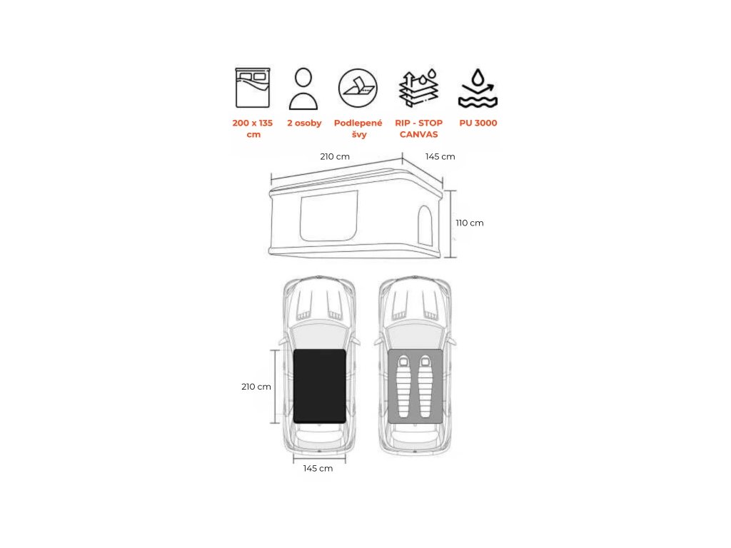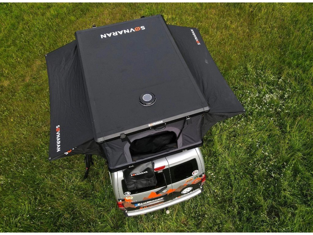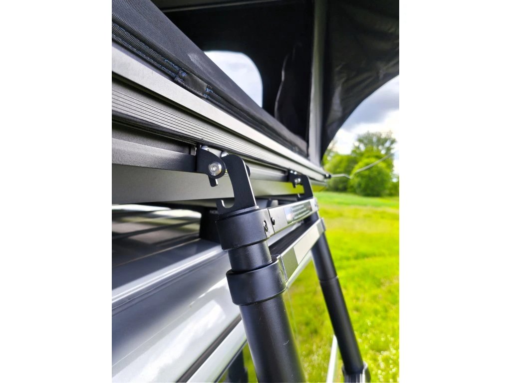 Základ celého stanu tvoří hliníková skořepina a hliníková podlaha. Právě tohle je v praxi důležité při častém používání, jízdě po horších cestách a celkovém zacházení, které běžné víkendové vybavení dlouhodobě nemusí zvládat. Výrobce uvádí i zesílené písty a odolné stěny z RIPSTOP canvasu, takže celek působí jako stan určený pro pravidelné nasazení, ne jen pro občasný výlet.